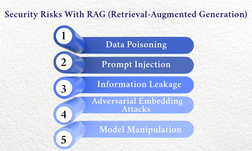 By combining generative models with outside data sources, RAG generates new, possibly vulnerable paths. Hackers may attempt to exploit the connection between the generation and retrieval processes, add erroneous data, or change the information that has been obtained.